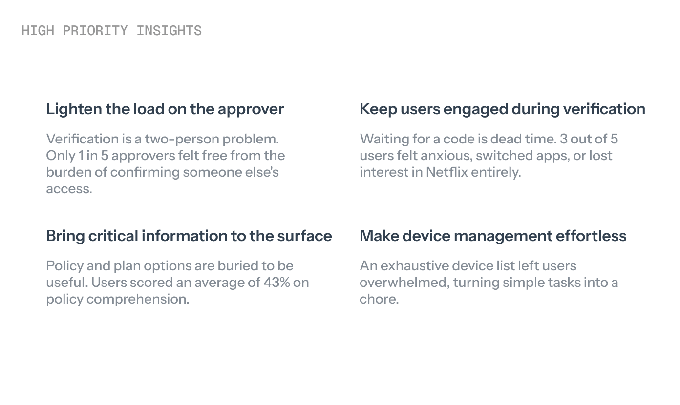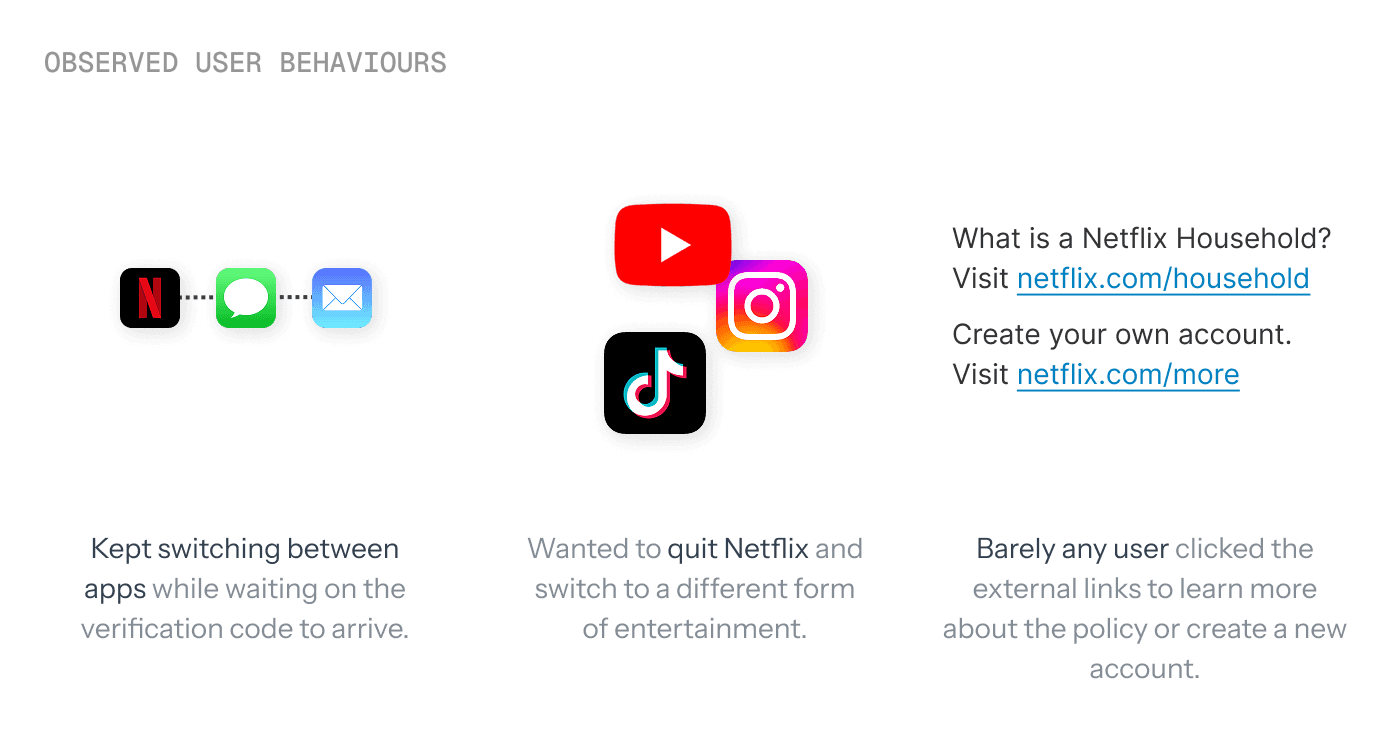 To uncover pain points, I conducted three 30-minute user tests on a mock-up of Netflix's current verification flow with the following script, establishing clear objectives to ensure actionable, user-centered insights.
