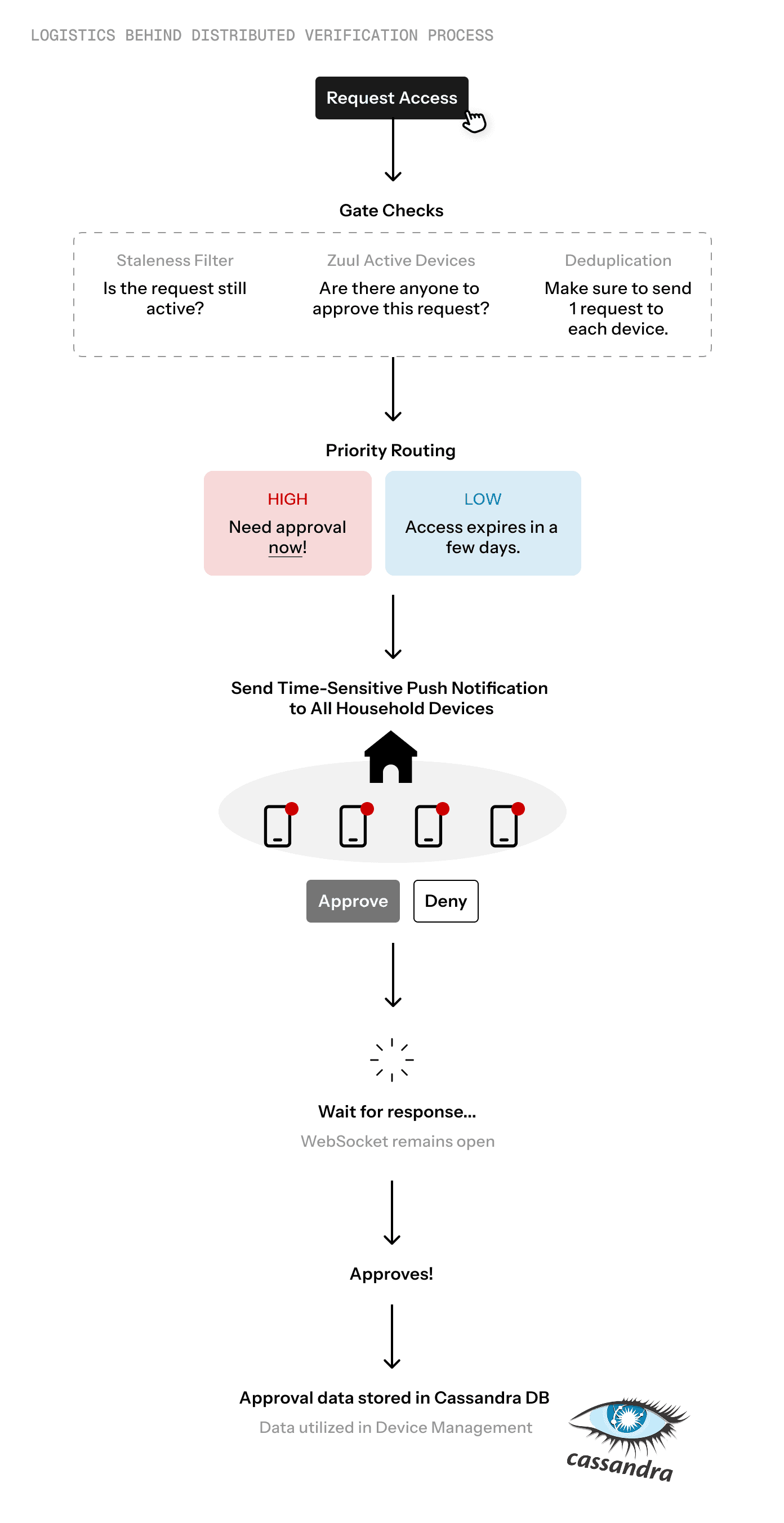 When triggered, the request fans out in parallel to every household device over persistent connections; the first to approve resolves it instantly, unanswered requests persist for pull-on-reconnect.